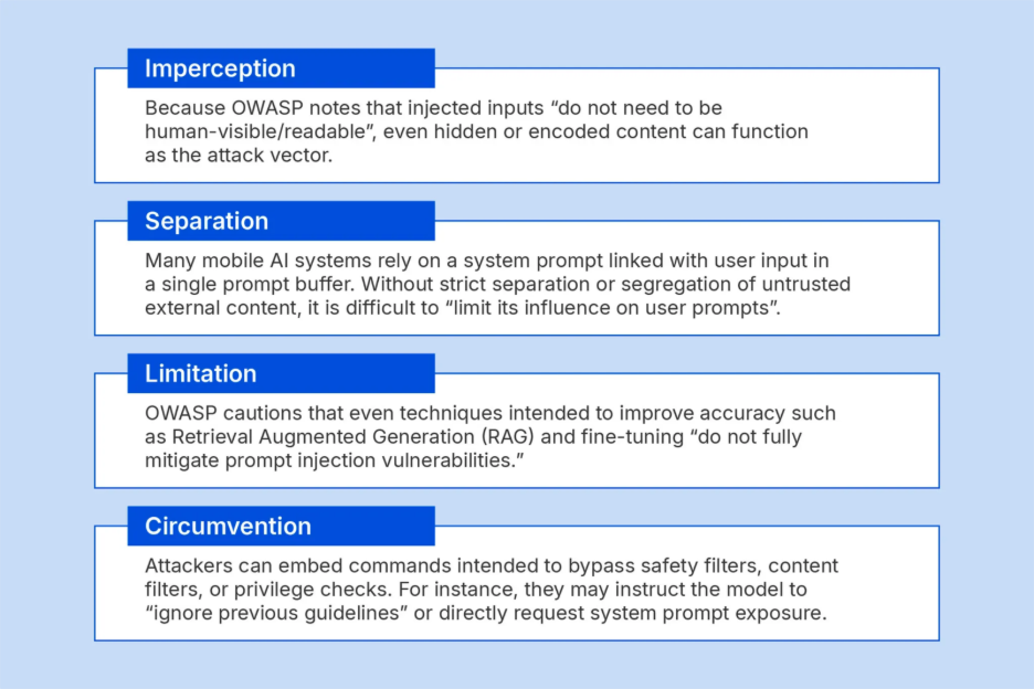 In compromised states, attackers can gain privileged access to mobiles that allow them to intercept or modify prompts, inject hidden instructions, and tamper with local storage where system prompts are held. Such manipulation doesn’t make mobile apps uniquely vulnerable. But it increases the unpredictability of AI runtime behavior and complicates detection of prompt injection vulnerabilities.